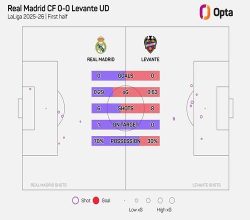 本場(chǎng)比賽上半時(shí)皇馬的表現(xiàn)很難用出色來(lái)形容,前45分鐘他們只嘗試了6次射門(mén),1次射正,相較而言萊萬(wàn)特上半時(shí)的射門(mén)次數(shù)達(dá)到了8次。