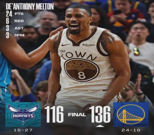 北京時間1月18日, NBA常規賽,勇士136-116大勝黃蜂。勇士后衛梅爾頓替補出戰21分27秒,投籃16中8,三分6中3,罰球5中5,得到24分6籃板3助攻1搶斷1失誤2犯規,正負值+24。得分勇士全隊最高,正負值并列全場最高。