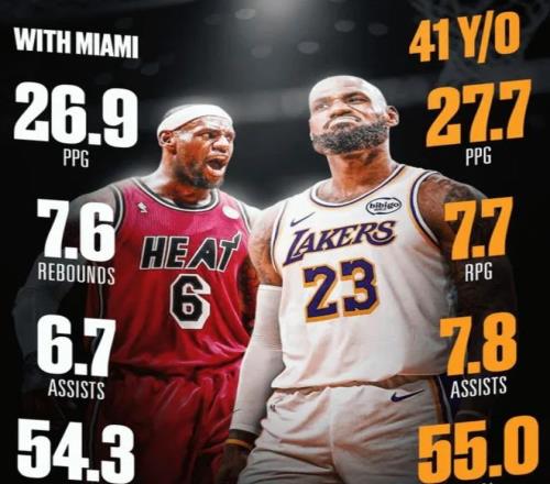 自從41歲生日夜以來,詹姆斯場均可以轟下 27.7分、7.7個籃板和7.8次助攻,投籃命中率高達55.0%,這一數(shù)據(jù)甚至超過了他熱火時期的巔峰表現(xiàn);他連續(xù)9場比賽得分超過20分,創(chuàng)造了40歲后NBA歷史最長連續(xù)得分20+紀錄;41歲場均得分榜,詹姆斯同樣以22.6分排名歷史第一。