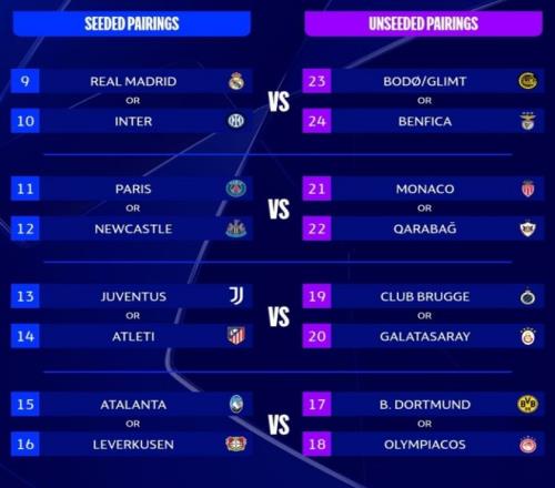 此外,國米/皇馬VS博德閃耀/本菲卡的附加賽兩支勝者,將再次與葡萄牙體育和曼城進(jìn)行16強(qiáng)對(duì)陣抽簽。