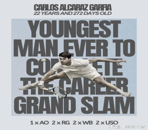 這一刻,阿爾卡拉斯不僅奪得了職業生涯第七座大滿貫冠軍獎杯,更實現了全滿貫的偉業。他以22歲272天的年紀,打破了美國傳奇唐·巴奇保持了87年的紀錄(22歲363天),成為網球歷史上最年輕的全滿貫得主。